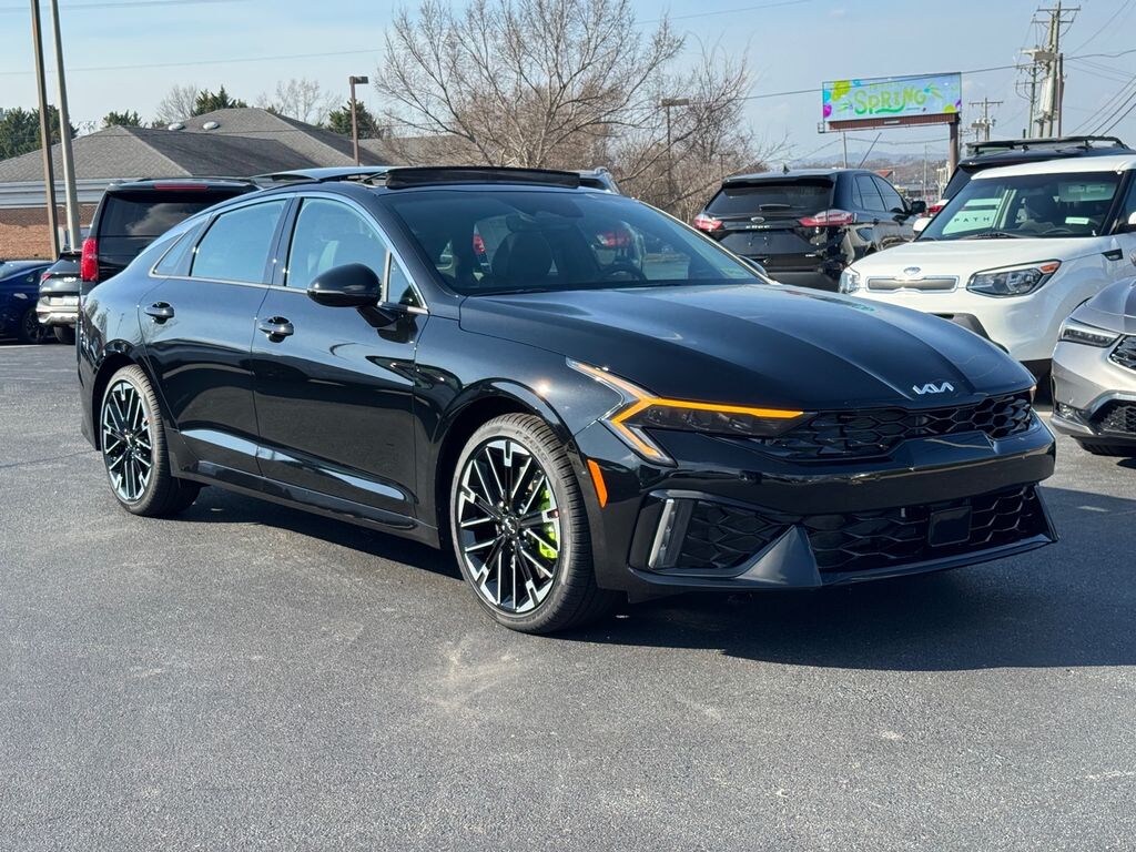 2026 Kia K5 GT Aurora Black Pearl 4-Wheel Disc Brakes, 6 Speakers, ABS brakes, Air Conditioning, Alloy wheels, AM/FM radio: SiriusXM, Auto High-beam Headlights, Auto-Dimming Mirror with HomeLink, Automatic temperature control, Brake assist, Bumpers: body-color, Cargo Mat, Carpeted Floor Mats, Delay-off headlights, Driver door bin, Driver vanity mirror, Dual front impact airbags, Dual front side impact airbags, Electronic Stability Control, Emergency communication system: Kia Connect (includes 1 year free trial), Four wheel independent suspension, Front anti-roll bar, Front Bucket Seats, Front Center Armrest, Front dual zone A/C, Front fog lights, Front reading lights, Fully automatic headlights, Heated door mirrors, Heated front seats, Heated Sport Bucket Seats, Illuminated entry, Knee airbag, Leather Shift Knob, Leather steering wheel, Low tire pressure warning, Navigation System, Occupant sensing airbag, Outside temperature display, Overhead airbag, Overhead console, Panic alarm, Passenger door bin, Passenger vanity mirror, Power door mirrors, Power driver seat, Power moonroof, Power steering, Power windows, Radio data system, Radio: AM/FM Audio System, Rear anti-roll bar, Rear reading lights, Rear seat center armrest, Rear side impact airbag, Rear window defroster, Remote keyless entry, Security system, Speed control, Speed-sensing steering, Split folding rear seat, Sport steering wheel, Steering wheel mounted audio controls, SynTex Seat Trim, Tachometer, Telescoping steering wheel, Tilt steering wheel, Traction control, Trip computer, Turn signal indicator mirrors, Variably intermittent wipers, Wheels: 19" x 8.0J Gloss Black Machined Finish Alloy.