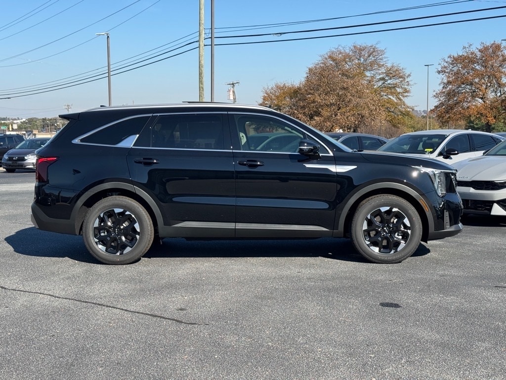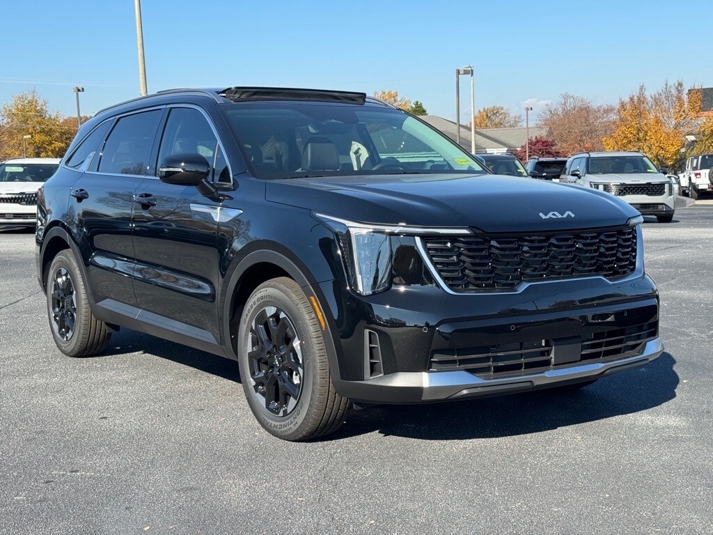 2026 Kia Sorento S Ebony Black 3rd row seats: split-bench, 4-Wheel Disc Brakes, 6 Speakers, ABS brakes, Air Conditioning, Alloy wheels, AM/FM radio: SiriusXM, Apple CarPlay & Android Auto, Auto High-beam Headlights, Auto-Dimming Mirror w/HomeLink, Automatic temperature control, Brake assist, Bumpers: body-color, Carpet Cargo Mat w/Seatback Protection, Carpeted Floor Mats, Delay-off headlights, Driver door bin, Driver vanity mirror, Dual front impact airbags, Dual front side impact airbags, Electronic Stability Control, Emergency communication system: 911 Connect, Exterior Parking Camera Rear, Four wheel independent suspension, Front anti-roll bar, Front Bucket Seats, Front Center Armrest, Front dual zone A/C, Front reading lights, Full-Length One-Touch Panoroof w/Sliding Sunshade, Fully automatic headlights, Heated door mirrors, Heated Front Bucket Seats, Heated front seats, Illuminated entry, Knee airbag, Leather Shift Knob, Leather steering wheel, LED Interior Lighting, Low tire pressure warning, Occupant sensing airbag, Outside temperature display, Overhead airbag, Overhead console, Panic alarm, Passenger door bin, Passenger vanity mirror, Power door mirrors, Power driver seat, Power steering, Power windows, Radio data system, Radio: AM/FM Standard Sound System, Rear anti-roll bar, Rear reading lights, Rear seat center armrest, Rear side impact airbag, Rear window defroster, Rear window wiper, Remote keyless entry, S Panoramic Sunroof Package, Security system, Speed control, Speed-sensing steering, Split folding rear seat, Spoiler, Steering wheel mounted audio controls, SynTex Artificial Leather Seat Trim, Tachometer, Telescoping steering wheel, Tilt steering wheel, Traction control, Trip computer, Turn signal indicator mirrors, Variably intermittent wipers, Wheels: 18" Gloss Black Alloy.